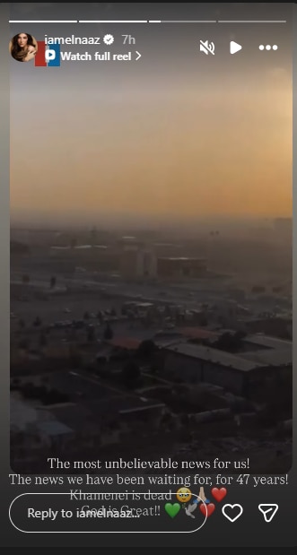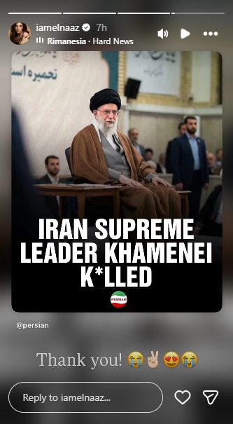 एलनाज ने इंस्टाग्राम पर स्टोरी पोस्ट करके इस खबर को सबसे बेहतरीन बताया. उन्होंने लिखा, 'हमारे लिए सबसे अविश्वसनीय न्यूज है. 47 साल से जिस खबर का इंतजार कर रहे थे, वो आ गई. खामेनेई मर गया है. भगवान सबसे बड़ा है.' एलनाज ने एक और स्टोरी पोस्ट की जिसमें उन्होंने खामेनेई की मौत वाली खबर शेयर करते हुए 'थैंक्यू' लिखा और खुशी वाले इमोजी भी शेयर किए.