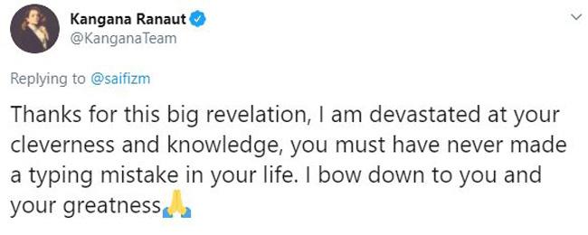 दरअसल, कंगना ने ट्वीट में दादा साहेब फाल्के की बजाय बाबा साहेब फाल्के लिख दिया था. उनकी इस गलती पर एक यूजर ने उन्हें प्वाइंट आउट किया. इसपर कंगना ने नाराज होते हुए उल्टा यूजर पर तंज कस दिया. यूजर ने लिखा- ये दादा साहेब फाल्के (धुंधीराज गोविंद फाल्के) है ना कि बाबा साहेब फाल्के. इस पर कंगना ने जवाब दिया- 'मेरी आंखे खोलने के लिए बहुत बहुत धन्यवाद. मैं आपकी समझदारी और ज्ञान देखकर हैरान हूं, आपने अपनी जिंदगी में कभी शायद ऐसी टाइपिंग मिस्टेक नहीं की होगी. मैं आपके और आपकी महानता के आगे सिर झुकाती हूं'. इस ट्वीट के बाद लोगों ने भी यूजर को ट्रोल कर दिया है.