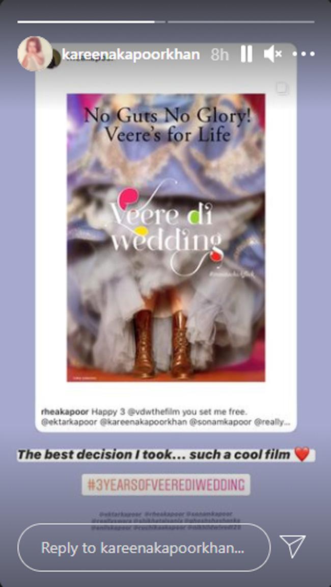 फिल्म के पलों को याद करते हुए करीना ने दावा किया कि सोनम, शिखा, स्वरा के साथ वीरे दी वेडिंग जैसी फिल्म का हिस्सा बनना 'उनके जीवन का सबसे अच्छा फैसला' था. उन्होंने अपनी इंस्टाग्राम स्टोरी में रिया के इंस्टाग्राम पोस्ट को री-पोस्ट किया है. करीना ने लिखा, "मैंने सबसे अच्छा निर्णय लिया... इतनी अच्छी फिल्म #3YearsOfVeereDiWedding." पोस्ट में, करीना ने अपने सभी सह-कलाकारों, निर्माताओं को टैग किया और एक दिल का इमोटिकॉन भी लगाया.