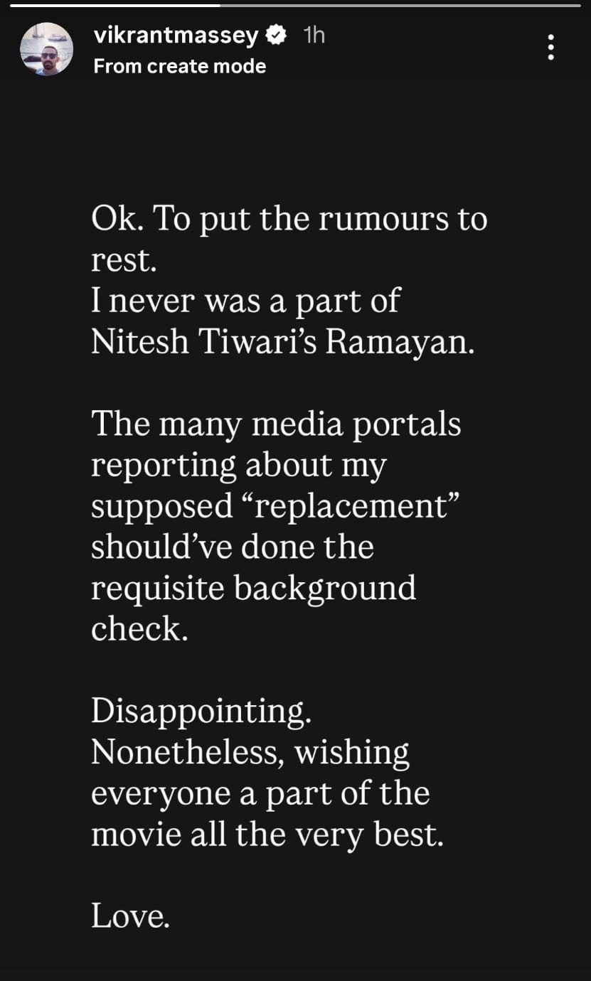 विक्रांत ने इंस्टाग्राम पर लिखा- ठीक है, अफवाहों पर विराम लगाते हुए मैं सारी बात साफ कर देता हूं. मैं नितेश तिवारी की रामायणम् फिल्म का कभी भी हिस्सा नहीं रहा. कई मीडिया पोर्टल मेरी “रिप्लेसमेंट” की खबरें चला रहे हैं, उन्हें खबर छापने से पहले थोड़ी ठीक से जांच-पड़ताल कर लेनी चाहिए थी. यह वाकई निराशाजनक है. फिर भी, फिल्म से जुड़े सभी लोगों को मेरी तरफ से ढेरों शुभकामनाएं. प्यार.