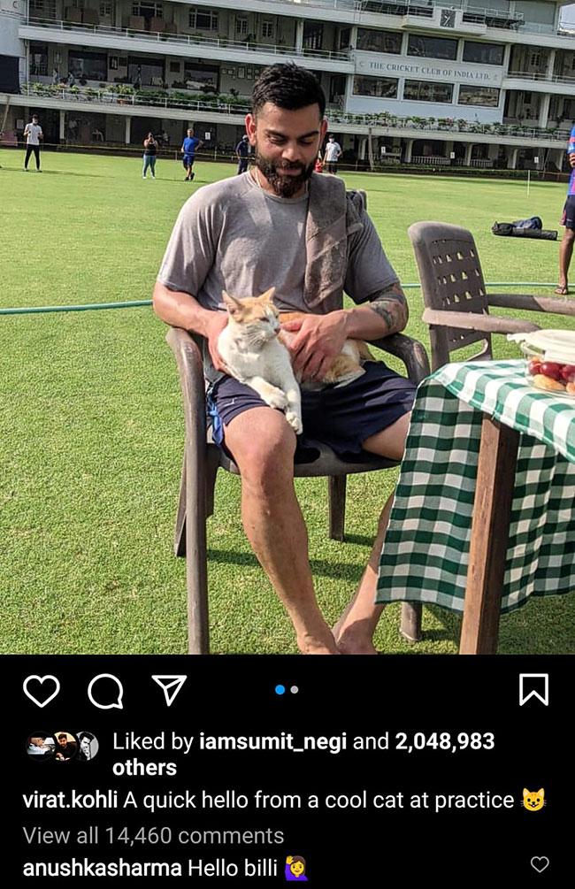 विराट की तस्वीर पर कमेंट करते हुए अनुष्का शर्मा ने लिखा- हैलो बिल्ली. विराट की हर पोस्ट पर फैंस को अनुष्का का रिएक्शन जानने में ज्यादा दिलचस्पी होती है. इस फोटो को शेयर करते हुए विराट ने लिखा- प्रैक्टिस के दौरान एक कूल कैट से हैलो. विराट कोहली को क्रिकेट ग्राउंड पर बिल्ली संग मस्ती करते देखना फैंस के लिए ट्रीट है. कम ही होता है जब विराट का मस्ती भरा फन साइड या कहे बिहाइंड द सीन जेस्चर लोगों को देखने को मिलता है.