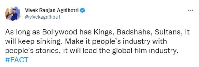 विवेक अग्निहोत्री ने शाहरुख खान और सलमान खान पर तंज कसा है. अपने लेटेस्ट ट्वीट में अग्निहोत्री ने बिना स्टार्स के नाम लिये उन्होंने कहा कि इंडस्ट्री जब तक इंडस्ट्री में वह हैं, फिल्म इंडस्ट्री डूबती ही रहेगी. एक ट्वीट में विवेक अग्निहोत्री ने लिखा, 'जब तक ये किंग, बादशाह और सुलतान बॉलीवुड में हैं, हिंदी सिनेमा डूबता ही रहेगा. लोगों की कहानी को आगे लाकर इसे लोगों की इंडस्ट्री बनाओ. तभी ये ग्लोबल फिल्म इंडस्ट्री बनकर लीड कर पाएगी. यही सच है.'