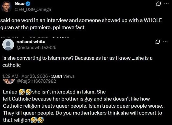 एक अन्य यूजर ने सवाल किया- क्या वो अब इस्लाम धर्म अपना रही हैं? क्योंकि जहां तक मुझे पता है, वो कैथोलिक हैं. एक और यूजर ने लिखा- वो इस्लाम में दिलचस्पी नहीं रखतीं. उन्होंने कैथोलिक धर्म इसलिए छोड़ा क्योंकि उनके भाई गे हैं और उन्हें उस धर्म का रवैया पसंद नहीं था. इस्लाम में भी LGBTQ लोगों के साथ सख्त व्यवहार होता है, तो क्या वो अब धर्म परिवर्तन करेंगी