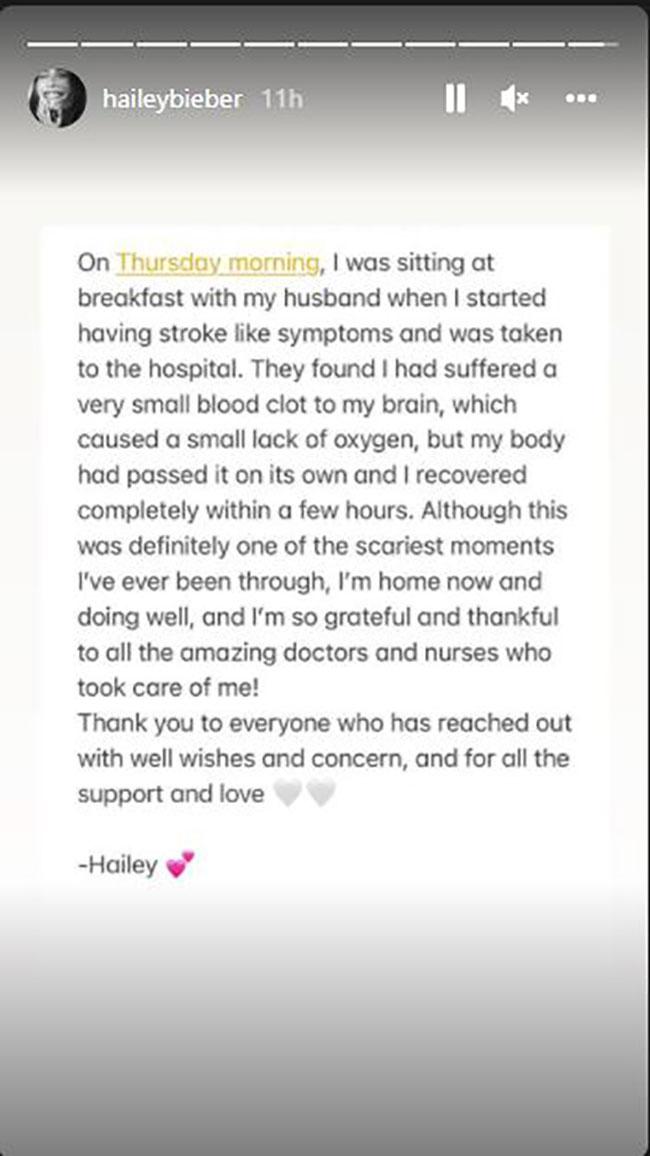 हेली बीबर ने लिखा- 'गुरुवार सुबह, मैं अपने पति के साथ नाश्ता करने बैठी थी जब मुझे स्ट्रोक जैसा महसूस होने लगा और फिर मुझे अस्पताल ले जाया गया. वहां पता चला कि मेरे दिमाग में एक छोटा सा ब्लड क्लॉट हो गया था, जिसके कारण ऑक्सीजन की कमी हो गई थी. पर मेरे शरीर ने अपने आप इस पर काबू पा लिया था और कुछ ही घंटों में मैं ठीक हो गई. ये मेरी जिंदगी के सबसे डरावने हादसों में से एक है, अब मैं घर पर हूं और अच्छी हूं. मैं सभी डॉक्टर्स-नर्सों जिन्होंने मेरी देखभाल की, उनकी आभारी हूं और उनका धन्यवाद करती हूं. इतने सपोर्ट और प्यार के लिए आप सभी का धन्यवाद.'