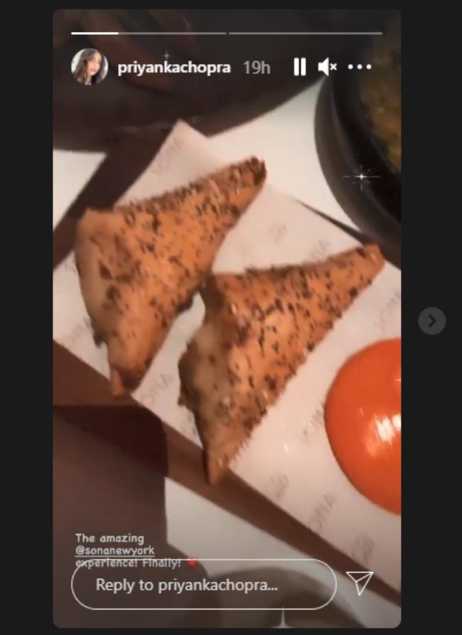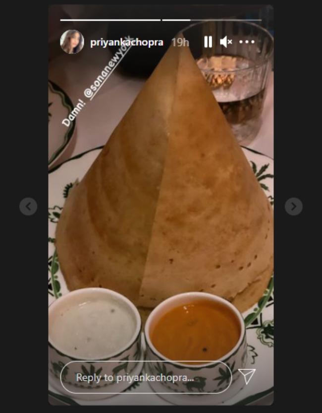 प्रियंका चोपड़ा ने अपने रेस्टोरेंट सोना में खाना खाते हुए कुछ तस्वीरें शेयर की हैं. उन्होंने फैंस को दिखाया कि वह क्या खा रही हैं. प्रियंका ने डोसा और उसके साथ सांभर और चटनी की तस्वीर शेयर की. इसके अलावा प्रियंका पकौड़े संग अन्य व्यंजनों का लुत्फ उठाती हुई भी नजर आईं.