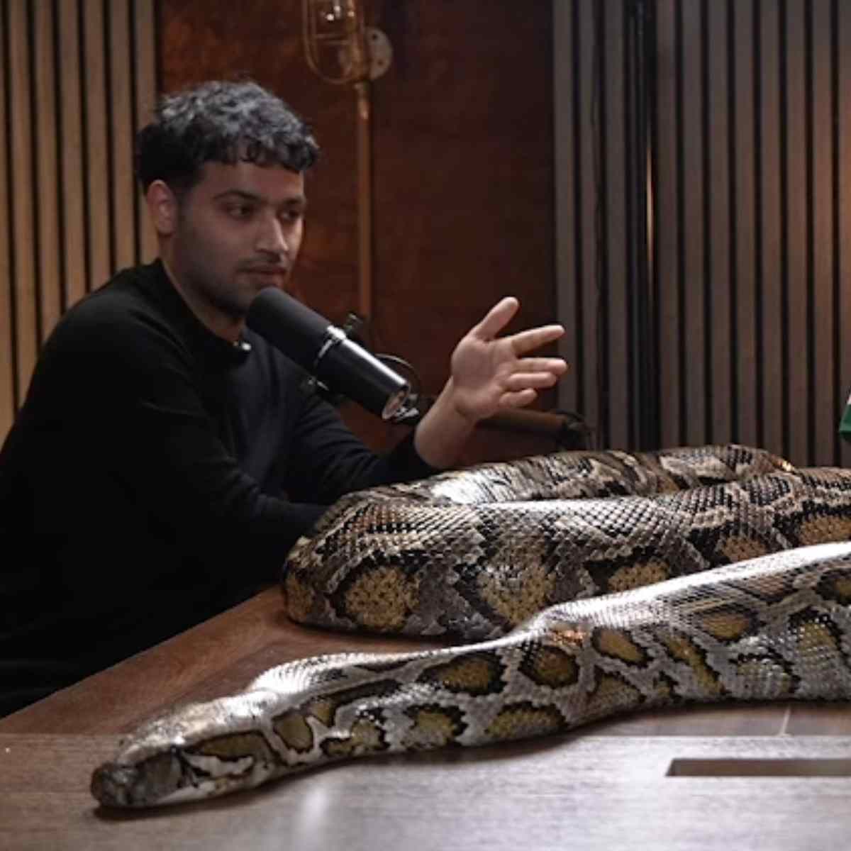 असली रोमांच तब शुरू हुआ जब स्टूडियो में विशालकाय बर्मीज अजगर की एंट्री हुई. इसे देखते ही वहां मौजूद लोगों की सांसें थम गईं. वह धीरे-धीरे अपनी जीभ बाहर निकाल रहा था, जो कि सांपों का दुनिया को समझने और महसूस करने का तरीका है. (Photo:YT/Raj Shamani)