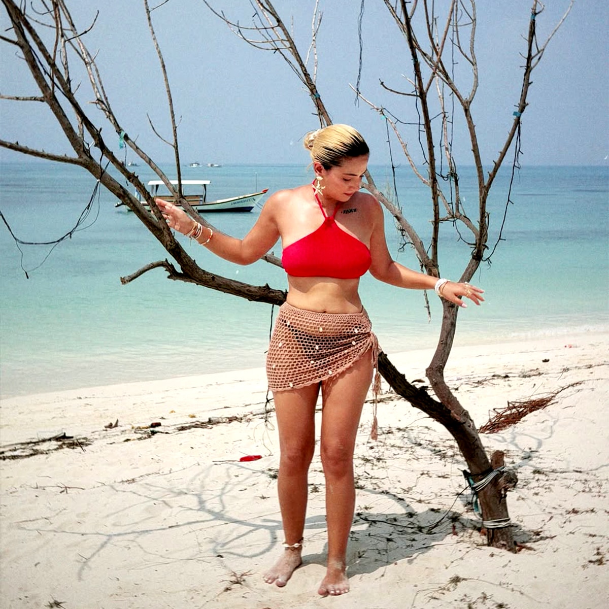 सदफ रेड कलर की हल्टर नेक बिकिनी टॉप और ब्लैक बिकिनी बॉटम में दिखीं. सदफ ने बिकिनी बॉटम संग नेट का स्कार्फ भी टीम अप किया है.