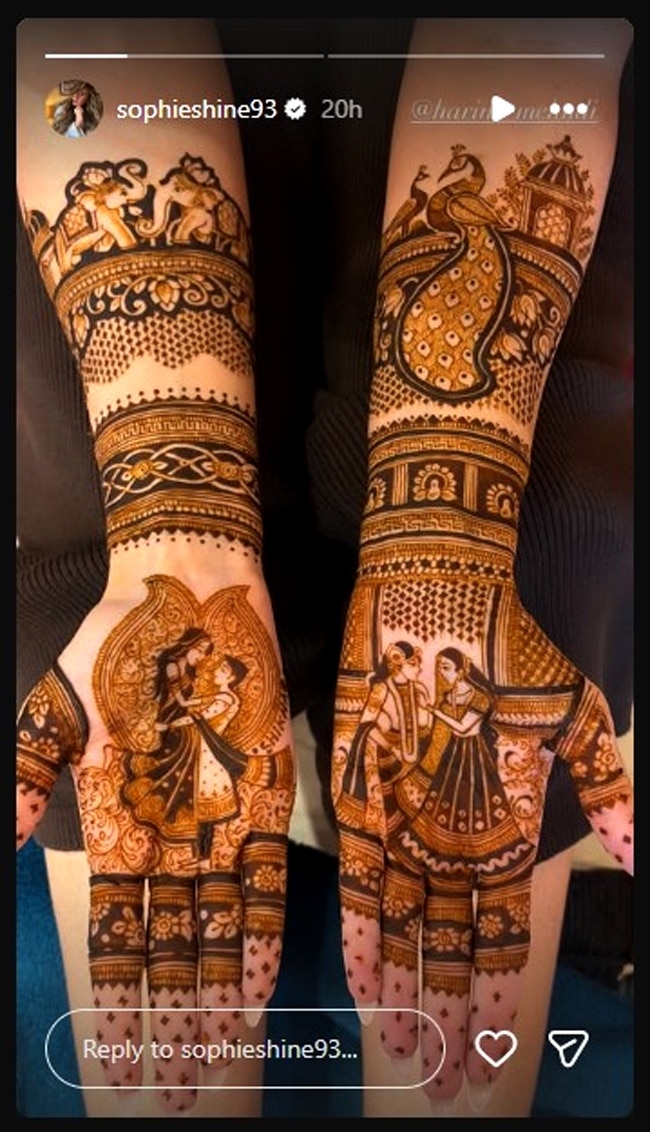 सोफी की चूड़ा सेरेमनी भी हुई. वो हाथों में चूड़ा पहने दिखीं, जिसे उन्होंने ढका हुआ है. इसके अलावा सोफी हाथों में कलीरे भी पहने नजर आईं. एक तस्वीर में सभी मेहमान उनपर फूलों की बरसात करते दिखे. तस्वीरें देखकर लग रहा है कि ये उनके हल्दी फंक्शन की हैं. हालांकि, उन्होंने मेंशन नहीं किया है. सोफी की बड़ी सी स्माइल उनकी खूबसूरती में चार चांद लगा रही है. सोफी ने कैप्शन में लिखा- बहुत सारी खुशियां.
