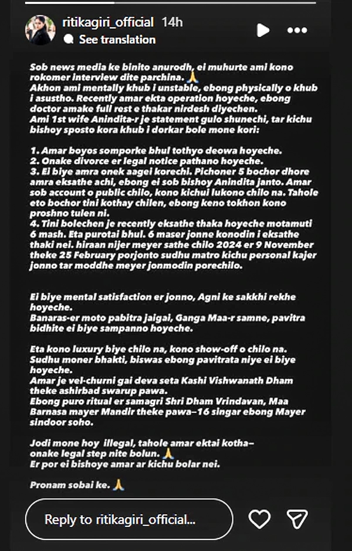 इस बीच रितिका गिरी ने एक इंस्टाग्राम स्टोरी शेयर कर मीडिया से इंटरव्यू न लेने का अनुरोध किया. जिसमें उन्होंने हाल ही में हुए ऑपरेशन के बाद मानसिक अस्थिरता और स्वास्थ्य समस्याओं का हवाला दिया. उसी बयान में उन्होंने अनिंदिता द्वारा किए गए कई दावों का जवाब दिया.