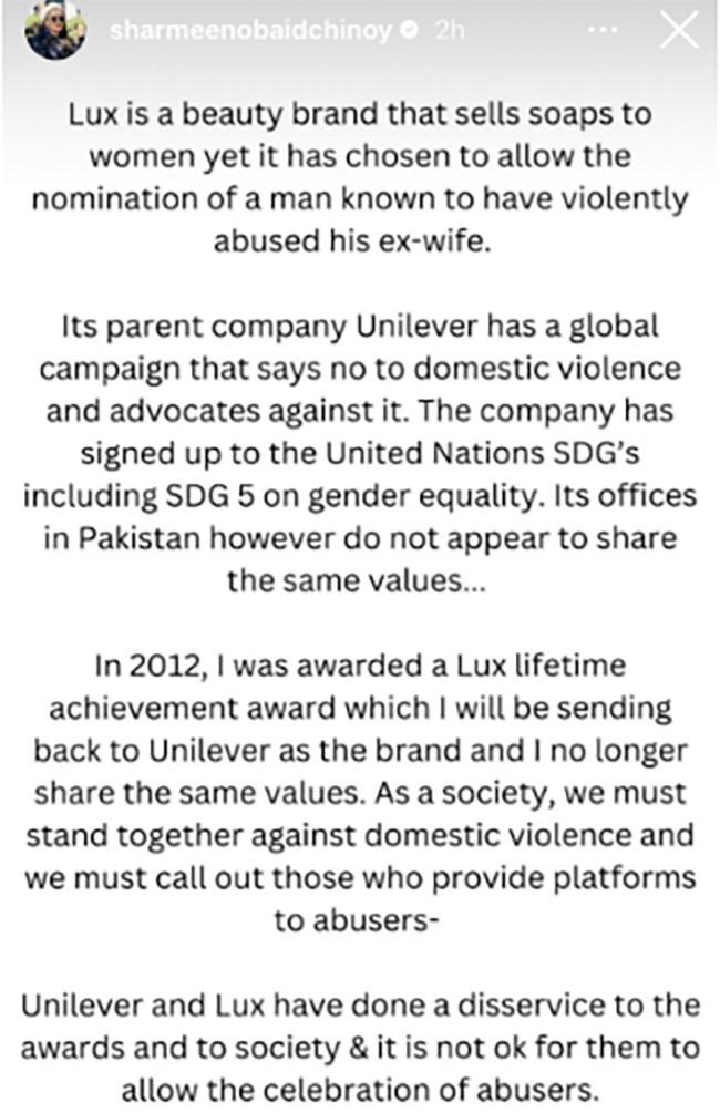 इससे पहले ऑस्कर विनिंग फिल्ममेकर शरमीन ओबैद-चिनॉय ने ऐलान किया कि वो अपना लक्स लाइफटाइम अचीवमेंट अवार्ड लौटाएंगी, जो उन्हें 2012 मिला था. शरमीन ओबैद-चिनॉय ने अपनी इंस्टाग्राम स्टोरी पर एक पोस्ट शेयर करके लक्स ब्रांड को भी फटकार लगाई. उन्होंने अपनी पोस्ट में लिखा कि लक्स एक ऐसा ब्यूटी ब्रांड है, जो महिलाओं को साबुन बेचता है, लेकिन इसने ऐसे एक्टर को नॉमिनेशन में रखा है, जो अपनी एक्स पत्नी को पीटने के लिए जाना जाता है. उन्होंने आगे लिखा की इसकी पैरेंट कंपनी Unilever डोमेस्टिक वॉयलेंस के खिलाफ कैंपेन चलाती है.