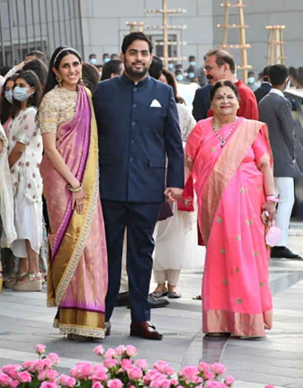 होने वाली छोटी बहू के इस खास मौके पर श्लोका मेहता ने ट्रेडिशनल लुक अपनाया. इवेंट में अपने पति के साथ पोज देते हुए वह रीगल साड़ी में बेहद खूबसूरत लग रही थीं. अंबानी परिवार के इस कपल के साथ कोकिलाबेन अंबानी ने भी साथ तस्वीरें खिंचवाईं. श्लोका मेहता ने गोल्डन बॉर्डर वाली गुलाबी रंग की सिल्क साड़ी को बेहद ही एलिगेंस से कैरी किया था. हेवी एम्ब्रॉयडरी वाले ब्लाउज के साथ श्लोका ने साड़ी को मैच किया. जो उनके पूरे लुक को और एनहेंस कर रहा था. इस पूरे लुक ज्यादा एलिगेंट बनाने के लिए श्लोका ने कोई हेवी ज्वेलरी नहीं पहनी, जिससे साड़ी में उनकी बेस्ट फिगर एक क्लासिक लुक दे सके.