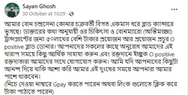 सायन घोष ने फेसबुक पर लंबा चौड़ा पोस्ट लिखा है. जिसमें सायन ने बताया कि उनके परिवार पर दुखों का पहाड़ टूटा है. एक्टर की बहन चंद्रसेना कोनार चक्रवर्ती 1 महीने से ब्लड कैंसर से जूझ रही है. पर दुख इस बात का है कि एक्टर चाहकर भी बहन की मदद नहीं कर पा रहे हैं. कैंसर जैसी गंभीर बीमारी का इलाज कराने में मोटा खर्च आता है. सायन घोष के पास इतनी रकम नहीं कि वो बहन का इलाज करा सकें. इसलिए अपनी आर्थिक स्थिति को देखते हुए उन्होंने लोगों से मदद की गुहार लगाई है.