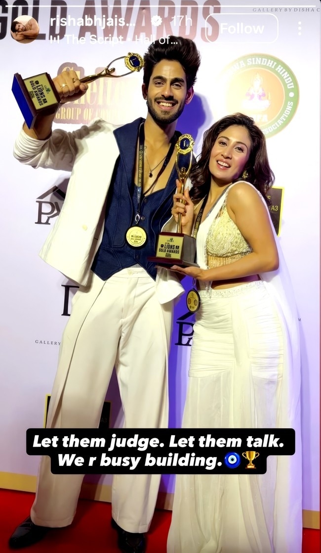 अपने सोशल मीडिया हैंडल पर श्रेया कालरा और ऋषभ जायसवाल ने एक अवॉर्ड इवेंट से अपनी एक फोटो शेयर की. फोटो में, कपल मैचिंग कपड़ों में ट्रॉफी उठाते हुए दिखे. श्रेया और ऋषभ एक-दूसरे के साथ प्यार से पोज देते हुए बहुत खुश लग रहे थे. फोटो शेयर करके, श्रेया और ऋषभ ने अपने ब्रेकअप की अटकलों पर चुप्पी तोड़ी. कपल ने बताया कि लोग उन्हें जज कर सकते हैं, लेकिन वे आगे बढ़ते रहेंगे, और वे इसी में बिजी हैं.