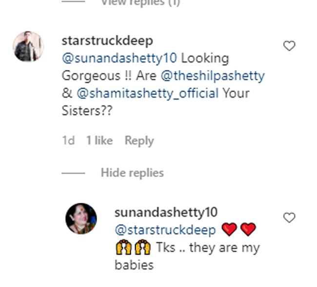 दरअसल एक फैन ने शिल्पा की मां सुनंदा की तारीफ करते हुए उनसे एक खास सवाल पूछा है. फैन ने सुनंदा शेट्टी के फोटो पर कमेंट सेक्शन में पूछा- आप गॉर्जियस लग रही हैं. क्या शिल्पा शेट्टी और शमिता शेट्टी आपकी बहनें हैं? फैन के इस सवाल पर एक्ट्रेसेस की मां सुनंदा शेट्टी ने जवाब दिया, "शुक्रिया, वो मेरी बेबीज हैं."