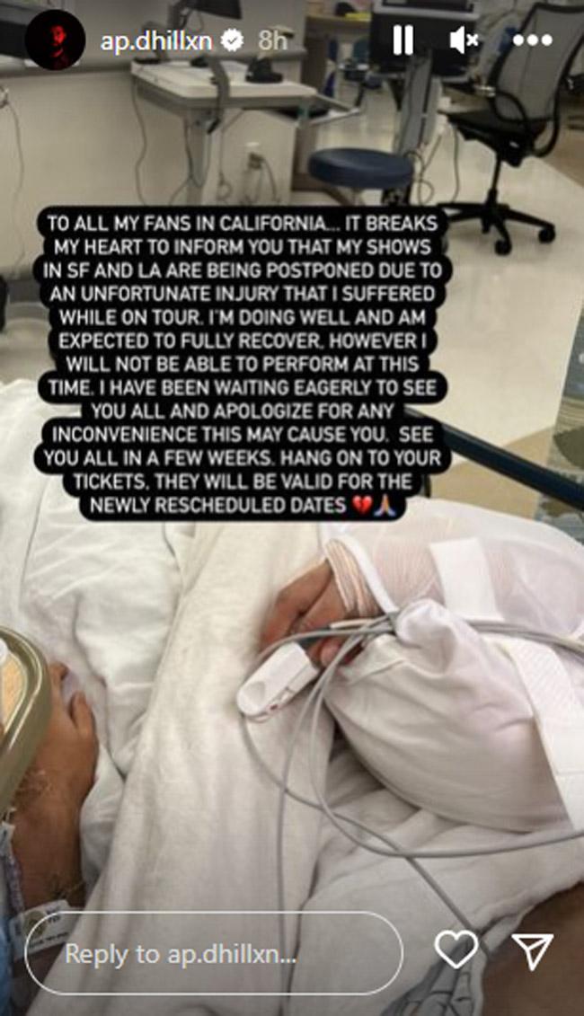 एपी ढिल्लन ने अपनी पोस्ट में लिखा- कैलिफोर्निया में मेरे सभी फैंस को ये बताने में दिल टूट रहा है कि SF और LA में मेरे शोज पोस्टपोन किए जा रहे हैं, क्योंकि टूर के दौरान मैं अचानक घायल हो गया हूं. मैं ठीक हूं. मैं जल्द ही पूरी तरह से रिकवर हो जाऊंगा. हालांकि, मैं इस समय परफॉर्म नहीं कर पाऊंगा. मैं आप सभी से जल्द मिलने के लिए बेकरार हूं और मेरी वजह से आपको किसी भी तरह की परेशानी हुई हो तो उसके लिए मैं माफी मांगता हूं. कुछ ही हफ्तों में आपसे मिलूंगा. आपके टिकट्स नए शेड्यूल किए गए शोज के लिए वैलिड रहेंगे.