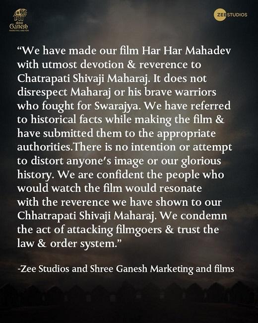 मेकर्स ने कहा- हमने फिल्म बनाते हुए सभी ऐतिहासिक तथ्यों का उल्लेख किया है और उसे सही अथॉरिटी को सौंपा है. हमारी कोई मंशा नहीं है कि किसी की भी इमेज को धूमिल किया जाए या हमारे इतिहास से छेड़छाड़ की जाए. हम मानते हैं कि जो भी दर्शक हमारी इस फिल्म को देखेंगे वो सही तरीके से छत्रपति शिवाजी महाराज को समझ पाएंगे. हम फिल्म देखने जाने वाले लोगों पर किए अटैक की कड़ी निंदा करते हैं. हमे कानून व्यवस्था पर पूरा भरोसा है.'