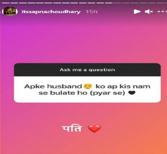 फैन्स ने जब सपना से उनकी मैरिज एनिवर्सरी की डेट के बारे में सवाल किया तो उन्होंने बताया कि उनकी शादी 24 जनवरी, 2020 को हुई. इसी तरह उनके दूसरे फैन्स ने उनसे पूछा कि वह अपने पचि वीर साहू को किस प्यारभरे नाम से बुलाती हैं. इसका जवाब देते हुए सपना ने कहा कि वह उन्हें 'पति' कहकर बुलाती हैं.
