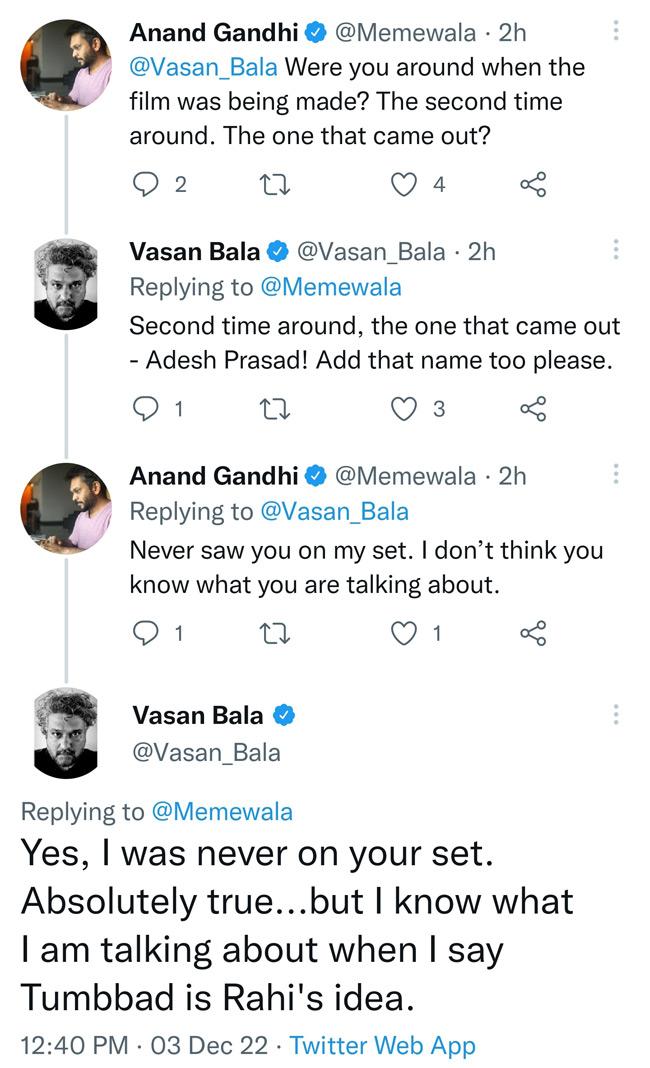 बाला ने आनंद के ट्वीट का जवाब देते हुए लिखा, 'तुम्बाड़ राही का आईडिया था... इसके आलावा, हां आपकी बात मान सकता हूं.' बाला का जवाब देते हुए आनंद ने कहा कि 'आप मेरी फिल्म के सेट पर मौजूद नहीं थे', लेकिन बाला भी अपनी बात पर टिके रहे. उन्होंने ये माना कि 'तुम्बाड़' के सेट पर वो मौजूद तो नहीं थे, लेकिन उन्हें अच्छे से पता है कि वो क्या बात कर रहे हैं.