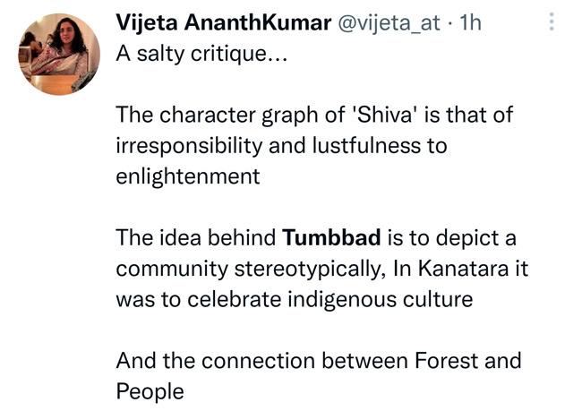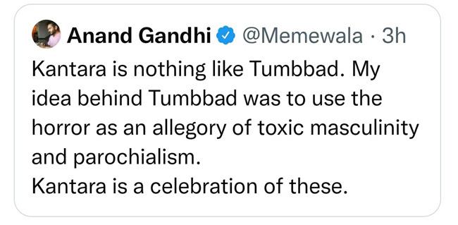 अपने ट्वीट में आनंद गांधी ने लिखा, 'कांतारा बिल्कुल भी तुम्बाड़ जैसी नहीं है. तुम्बाड़ के पीछे मेरा आईडिया ये था कि हॉरर को टॉक्सिक मस्क्युलिनिटी (मर्दवाद) और संकीर्णता के प्रतीक के रूप में प्रयोग किया जाए. कांतारा इनी चीजों का सेलेब्रेशन है.'
