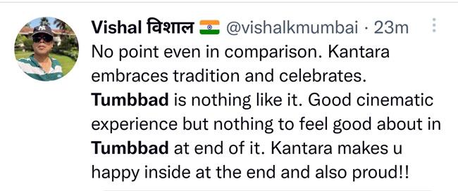 आनंद के इस ट्वीट के रिप्लाई में अब सोशल मीडिया यूजर्स की एक नई बहस छिड़ गई है कि 'कांतारा' और 'तुम्बाड़' में से कौन सी फिल्म ज्यादा बेहतर है. एक यूजर ने लिखा, 'तुलना करने की कोई वजह ही नहीं है. कांतारा कल्चर को स्वीकार करती है और सेलिब्रेट करती है. तुम्बाड़ बिल्कुल भी ऐसी नहीं है. अच्छा सिनेमेटिक एक्सपीरियंस था, लेकिन तुम्बाड़ के अंत में अच्छा महसूस करने लायक कुछ भी नहीं था. कांतारा अंत में आपको खुश करती है और गर्व भी महसूस करवाती है.' इसके अलावा बहुत से यूजर्स ने ये भी कहा कि 'कांतारा' जंगल और वहां के लोगों के बीच के रिश्ते को भी दिखाती है.