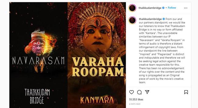 केरल के एक पॉपुलर म्यूजिक बैंड Thaikudam Bridge ने कुछ दिन पहले अपनी सोशल मीडिया पोस्ट में 'कांतारा' के मेकर्स पर धुन चुराने का का आरोप लगाते हुए कानून का दरवाजा खटखटाया था. बैंड का आरोप था कि 'कांतारा' का गाना 'वराह रूपम', उनकी इंटेलेक्चुअल प्रॉपर्टी ये उनके अपने ओरिजिनल गाने 'नवरसम' से हुबहू मिलता है.