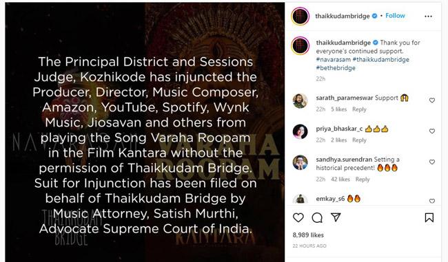 अब Thaikudam Bridge ने इस पूरे मामले पर एक ताजा अपडेट शेयर करते हुए बताया है कि कोर्ट ने, 'कांतारा' के मेकर्स को उनकी परमिशन के बिना 'वराह रूपम' गाना चलाने से मना किया है. अपनी ताजा पोस्ट में Thaikudam Bridge बैंड ने बताया, 'कोलिकोड़ के प्रिंसिपल डिस्ट्रिक्ट और सेशन जज ने प्रोड्यूसर, डायरेक्टर, म्यूजिक कम्पोजर, अमेजन, यूट्यूब, स्पोटिफाई, विंक म्यूजिक, जियोसावन और अन्य सभी को Thaikudam Bridge की इजाजत के बिना 'कांतारा' फिल्म में 'वराह रूपम' गाना चलाने के लिए मना किया है.'