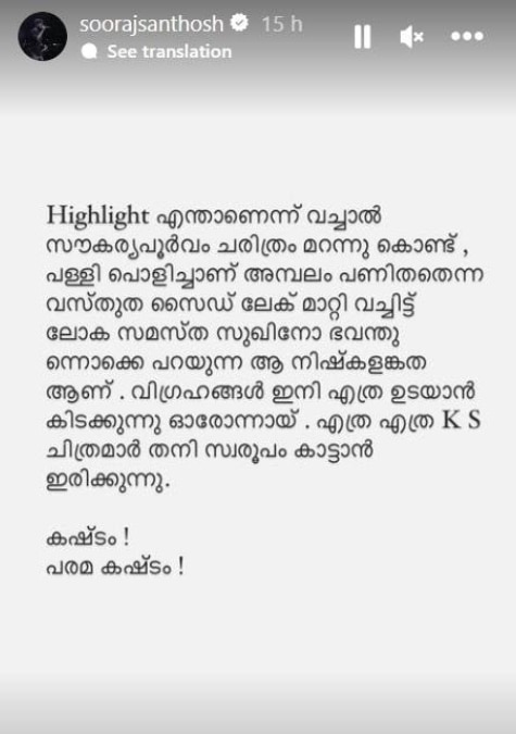 चित्रा की अपील पर भक्तों ने जहां पॉजिटिव रिस्पॉन्स दिया, वहीं कुछ सेलिब्रिटीज को ये रास नहीं आया. सिंगर सूरज संतोष ने अपने इंस्टाग्राम पर चित्रा की अपील को शेयर किया और लिखा- हाइलाइट करने लायक उन लोगों की मासूमियत है जो कहते हैं, "लोक समस्त सुखिनो भवन्तु". वो आसानी से इतिहास को भूल जाते हैं, इस तथ्य को किनारे रख देते हैं कि मंदिर एक मस्जिद को ध्वस्त करके बनाया गया था. एक-एक करके कितनी मूर्तियां टूटेंगी? और कितने केएस चित्रा अपना असली रंग दिखाएंगे? दया आती है.