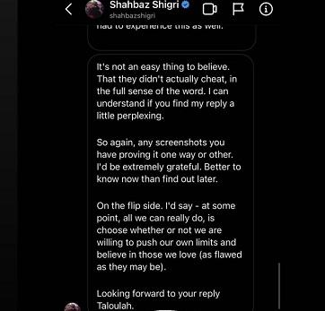 लेकिन ऐमा और शहबाज की चुप्पी का लगता है किसी को रास नहीं आई. ऐमा के एक्स बॉयफ्रेंड केस अहमद की एक्स गर्लफ्रेंड ब्रिटिश मॉडल तालुलाह मायर ने चैट स्क्रीनशॉट शेयर कर सिंगर पर इल्जाम लगा दिया. तालुलाह ने कहा कि ऐमा शहबाज संग रिलेशन में रहकर अपने एक्स-बॉयफ्रेंड के साथ उन्हें धोखा दे रही थीं. तालुलाह ने ऐमा और केस की चैट के स्क्रीनशॉट भी शेयर किए. इस कॉन्ट्रोवर्सी ने देखते ही देखते तूल पकड़ लिया. एक-एक कर के हर किसी को अपनी सफाई देने आना पड़ा.