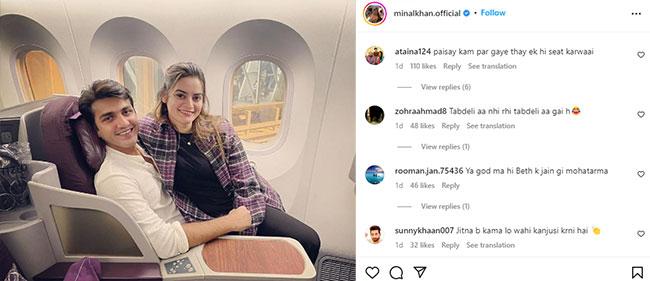 फोटो में आप देख सकते हैं कि मिनाल खान अपने पति की गोद में बैठी हुई नजर आ रही हैं. मिनाल और उनके हसबैंड दोनों कैमरे को देखकर पोज दे रहे हैं. दोनों की बड़ी सी स्माइल से इतना तो साफ है कि वो एक दूसरे संग काफी अच्छा टाइम स्पेंड कर रहे हैं. लेकिन प्लेन में कपल का कोजी होना पाकिस्तान की जनता को पसंद नहीं आया. सोशल मीडिया यूजर्स कपल को खूब ट्रोल कर रहे हैं और उनकी रोमांटिक तस्वीर को चीप और वल्गर बता रहे हैं.