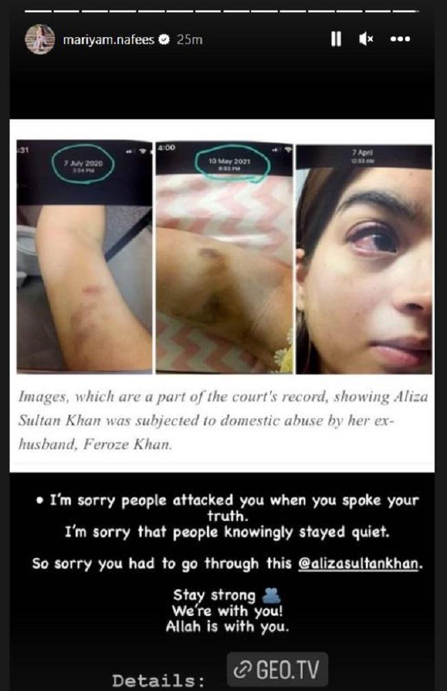 सईदा अलीजा के सबूतों की तस्वीर सामने आने के बाद पाकिस्तानी इंडस्ट्री में तूफान खड़ा हो गया है. इंडस्ट्री से जुड़े कई जाने-माने एक्टर्स ने फिरोज खान को लेकर अपना रिएक्शन दिया है. तमाम एक्टर्स ने फिरोज के अपनी पत्नी पर किए जुल्म करने को गलत बताया है. एक्ट्रेस मरियम नफीस ने अलीजा के नाम एक पोस्ट शेयर करते हुए लिखा कि सभी उनके साथ खड़े हैं और फिरोज की हरकतों की निंदा करते हैं.