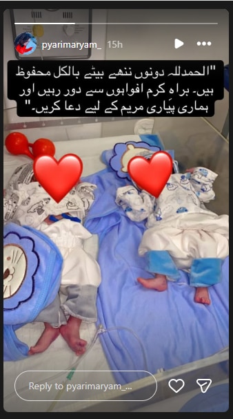 अहसान अली ने अपने और मरियम के जुड़वां बच्चों की फोटो शेयर की है. उन्होंने बताया कि दोनों बच्चे पूरी तरह सुरक्षित हैं. साथ ही लोगों से झूठी अफवाहें फैलाने से बचने की अपील की. उन्होंने लिखा, 'अल्हम्दुलिल्लाह, दोनों नवजात बच्चे पूरी तरह सुरक्षित हैं. कृपया अफवाहें फैलाने से बचें और हमारी प्यारी मरियम के लिए दुआ करें.' रिपोर्ट्स के अनुसार, प्यारी मरियम ने जुड़वां लड़कों को जन्म दिया था और जन्म देने के बाद उनकी तबीयत बिगड़ने लगी. मरियम के निधन से चारों तरफ दुख की लहर दौड़ गई है और उनके फैंस संग इन्फ्लुएंसर दोस्त शोक में डूब गए हैं. साथ ही मरियम के परिवार को सांत्वना दे रहे हैं.