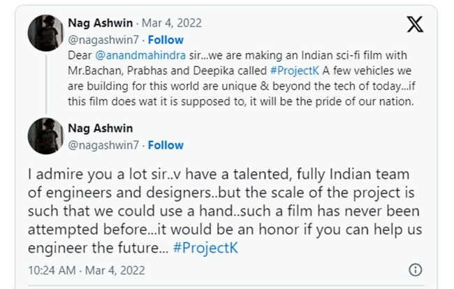 'कल्कि 2898 AD' के डायरेक्टर नाग अश्विन ने 2022 में महिंद्रा ग्रुप के चेयरपर्सन, आनंद महिंद्रा से अपनी फिल्म के लिए सोशल मीडिया पर हेल्प मांगी थी. उन्होंने लिखा था कि अपनी साइंस-फिक्शन फिल्म में दिखाए गए संसार के लिए उनकी टीम कुछ यूनीक और आज की तकनीक से कहीं आगे की गाड़ियां डिजाईन कर रही है.