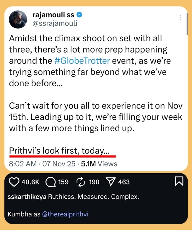 राजामौली के बेटे, असिस्टेंट डायरेक्टर और प्रोड्यूसर एस एस कार्तिकेय ने भी Globetrotter से पृथ्वीराज का पोस्टर अपने इंस्टाग्राम पर शेयर किया था. अपनी पोस्ट में उन्होंने लिखा था 'कुंभ एज पृथ्वीराज' यानी 'कुंभ, पृथ्वीराज के रोल में.' जाहिर सी बात है, ये भी उल्टा है. नॉर्मल सीधी लाइन होती 'पृथ्वीराज एज कुंभ' यानी 'कुंभ के रोल में पृथ्वीराज.' कई जिज्ञासु फैन्स ने राजामौली और कार्तिकेय के सोशल मीडिया पोस्ट्स में नोटिस किया था कि ये लोग कुछ चीजें उल्टी लिख रहे हैं. क्या ये इस बात का हिंट हो सकता है कि Globetrotter की कहानी में 'मिरर डायमेंशन' वाली थ्योरी चीज हो सकती है?