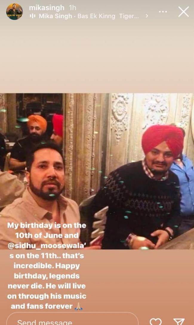 वहीं मीका सिंह ने सिद्धू मूसेवाला की फोटो को इंस्टाग्राम स्टोरी पर शेयर किया है. इस फोटो में मीका और सिद्धू साथ बैठे हैं. फोटो के लिए पोज देते हुए सिद्धू को मुस्कुराते हुए देखा जा सकता है. मीका ने कैप्शन में लिखा, 'मेरा जन्मदिन 10 जून को होता है और सिद्धू मूसेवाला का 11 जून को. यह बेहतरीन है. हैप्पी बर्थडे. लेजेंड कभी नहीं मरते. वो अपने फैंस और म्यूजिक के सहारे हमेशा जिएंगे.'