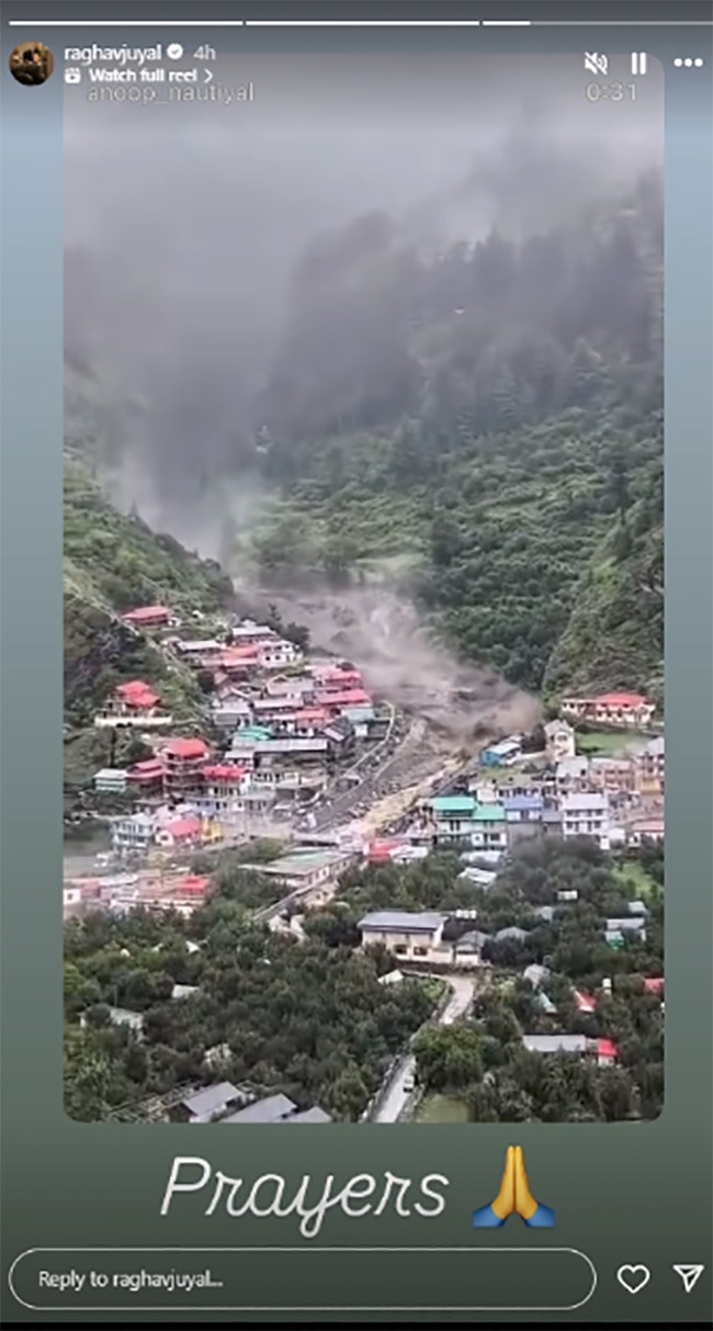 एक्टर-डांसर राघव जुयाल उत्तरखंड के रहने वाले हैं. भयानक हादसे पर उन्होंने चिंता जताई है. राघव ने इंस्टाग्राम स्टोरी पर उत्तराखंड का वीडियो शेयर किया है. उन्होंने दर्दनाक वीडियो शेयर करते हुए हाथ जोड़ने वाले इमोजी बनाई है. साथ ही लिखा है कि प्रार्थनाएं.