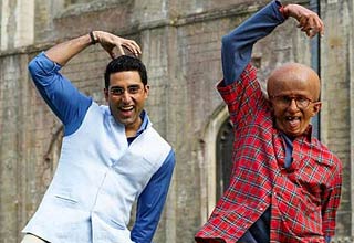 अभिषेक बच्चन अपनी पत्नी अभिनेत्री ऐश्वर्या राय बच्चन के साथ. फिल्म 'पा' में अभिषेक ने अमिताभ के पिता का किरदार निभाया है.