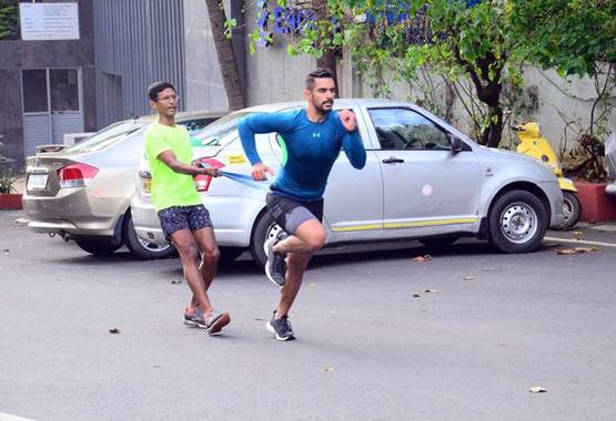 अंगद ने नियॉन ब्लू कलर की फुल स्लीव टीशर्ट और ब्लैक-ग्रे शॉर्ट्स पहन रखे थे. इसके साथ ब्लैक कलर के शूज पहने अंगद काफी फिट लग रहे थे.