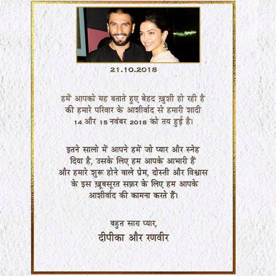 शादी के कार्ड में इस बात का जिक्र नहीं किया गया है कि दीपिका और रणवीर की शादी कहां पर होगी. हालांकि उम्मीद की जा रही थी कि दोनों स्टार्स विदेश में देसी अंदाज में शादी करेंगे.