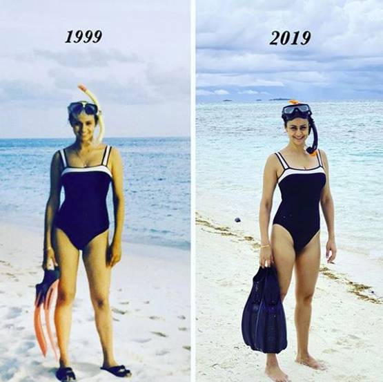 इस कोलाज फोटो की खास बात यह है कि इसमें एक फोटो साल 1999 और दूसरी फोटो 2019 की है. दोनों में उन्होंने एक जैसा ही स्विम सूट पहना है. इसके कैप्शन में उन्होंने लिखा, ''तब और अब. 20 साल बाद मालदीव में वापसी.''
