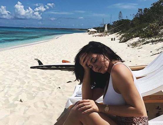 एक तस्वीर में काइली गुलाबी रंग के वन पीस क्रिश्चयन डायर बाथिंग सूट में नजर आ रही हैं और उनके एक हाथ में फोन है. तस्वीर के कैप्शन में काइली ने 'एमआईए' लिखा है.