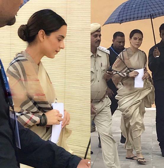 इन दिनों जयपुर में फिल्म का सीक्वेंस शूट हो रहा है. इन तस्वीरों में कंगना रनौत रानी लक्ष्मीबाई की तरह साड़ी पहने नजर आ रही हैं. उन्होंने क्रीम कलर की साड़ी और लाल बिंदी लगाई है. साथ ही एक चैक वाला शॉल कंधे पर डाला हुआ है. वह शूटिंग से पहले अपनी डायलॉग की तैयारी कर रही हैं.