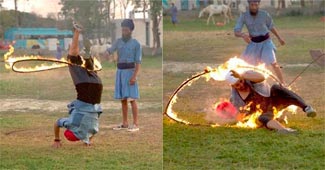 कुमार जैसे ही फायर रिंग वाले स्टंट को अंजाम दे रहे थे तभी उनके पैर में आग लग गई. मौके पर मौजूद ट्रेनर ने उन्हें संभाल लिया.