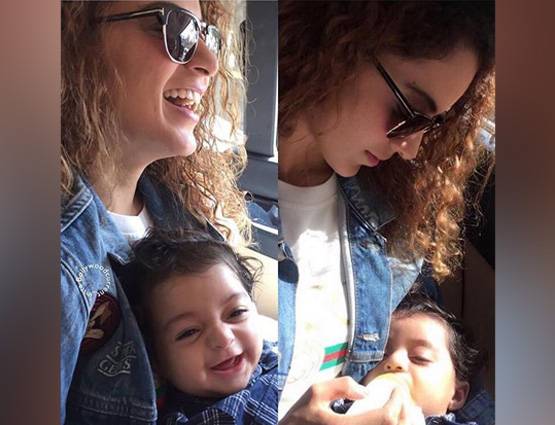 तस्वीर में कंगना पृथ्वी को बोतल से दूध पिला रही हैं. एक्ट्रेस अपने भांजे से बहुत प्यार करती हैं. जो तस्वीरों से साफ झलकता है.