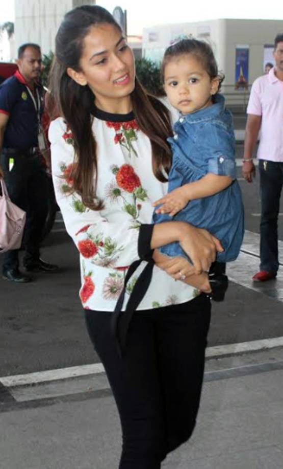 मीशा मम्मी की गोद में नजर आई. मीरा अपनी लाडली को बचपन से ही काफी स्टाइल बनाकर रखती हैं. तस्वीरों में मीशा ने ब्लू डेनिम फ्रॉक पहनी है.