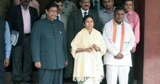 बजट भाषण पेश करने के लिए अपने सहयोगियों के साथ संसद पहुंचे प्रणब मुखर्जी.