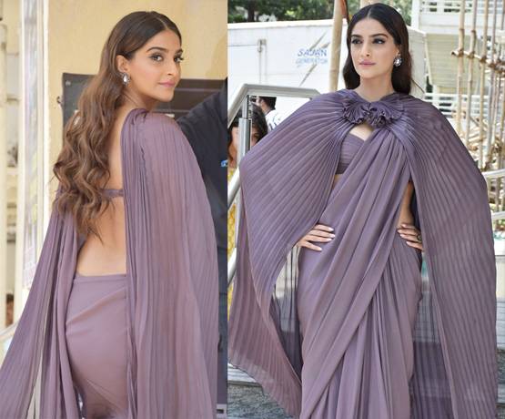 बॉलीवुड फैशनक्वीन कही जाने वाली सोनम ने इवेंट में ग्रे कलर साड़ी के साथ मिड लेंथ मैचिंग केप पहनी थी.