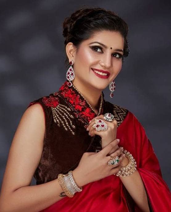 इन तस्वीरों में सपना ने रेड साड़ी के साथ नेट ब्लैक ब्लाउज मैच किया है. जूलरी में लॉन्ग ईयरिंग्स कैरी किए हैं.