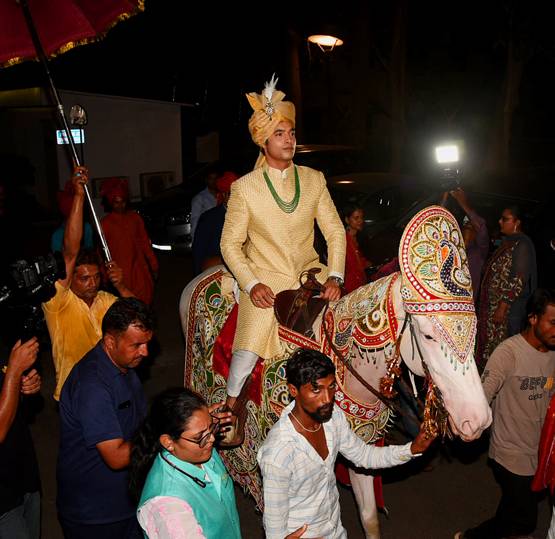 शरद बारात पूरे परिवार संग नाचते-गाते हुए अपनी बारात लेकर पहुंचे. क्रीम कलर की शेरवानी और पगड़ी बांधे हुए शरद दूल्हा बनकर, घोड़ी चढ़कर बारात लेकर पहुंचे.