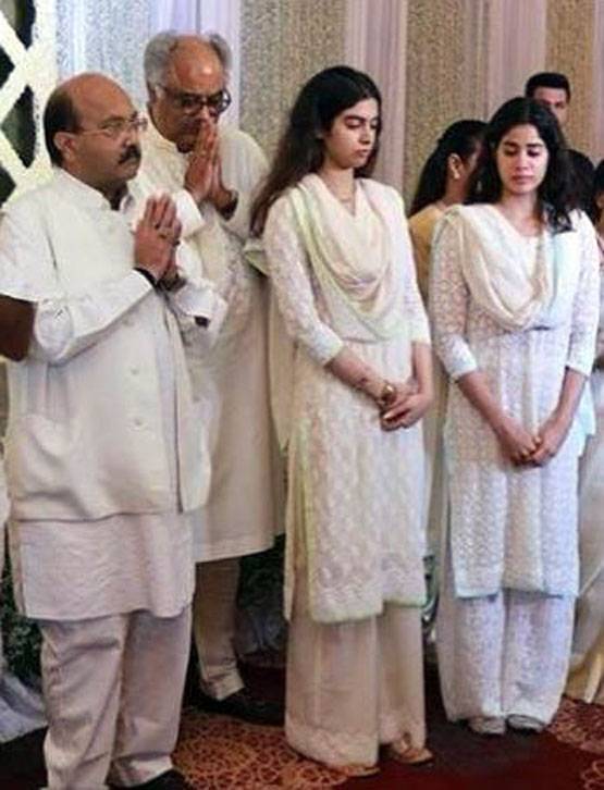 प्रार्थना सभा की तस्वीरों में बोनी कपूर अपनी दोनों बेटियों के साथ बेहद भावुक नजर आ रहे हैं.