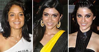 फिल्म 'लव, ब्रेकअप और जिंदगी' की प्रीमियर पार्टी में आई बालाएं मीडिया को पोज देती हुई.